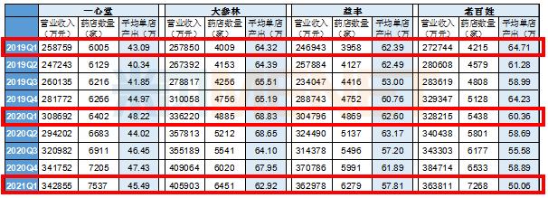 表1:四大上市连锁2019-2021年一季度平均单店产出分析