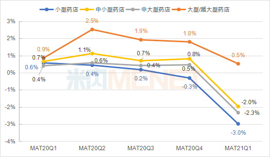2020年受疫情影响,作为提供防疫产品的实体药店,总体有所获益——从米内网中国城市实体药店终端竞争格局显示,2020年实体药店经营规模达5576亿元(含非药品),较2019年上升了3.85%。在需求猛增之后,需求平稳回落则在2021年一季度体现出来。