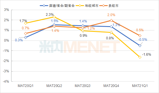 依据药店年销售额可将药店分成四大类型,分别是小型药店(销售年规模≤100万元)、中小型药店(100万元<销售年规模≤300万元)、中大型药店(300万元<销售年规模≤500万元)及大型/超大型药店(销售年规模>500万元)。从图1销售趋势图来看,不管是哪一类型药店,2021年一季度增长趋势均呈下滑之态势,其中中、小型药店下滑最为明显,出现负增长态势,这与一季度春节,以及防疫产品销售回落有关,而大型与超大型药店增长幅度虽然收窄,但仍为正增长的态势。从不同城市级别来看(见图2),县级城市的增长趋势好于非县级城市,呈正增长趋势,但涨幅有所收窄,而地级城市在2021年一季度的增长趋势令人担忧。
