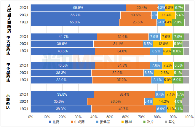 图3:各类规模药店各大类产品2019-2021年一季度销售份额