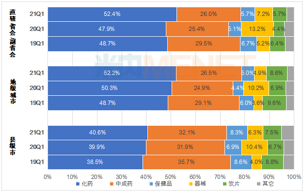 图4:不同城市级别药店各大类产品2019-2021年一季度销售份额